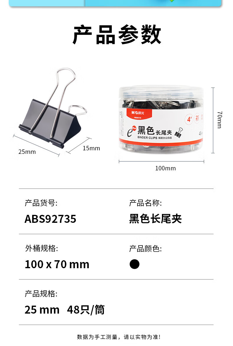 晨光 ABS92735 黑色 长尾夹 25mm 48只/筒